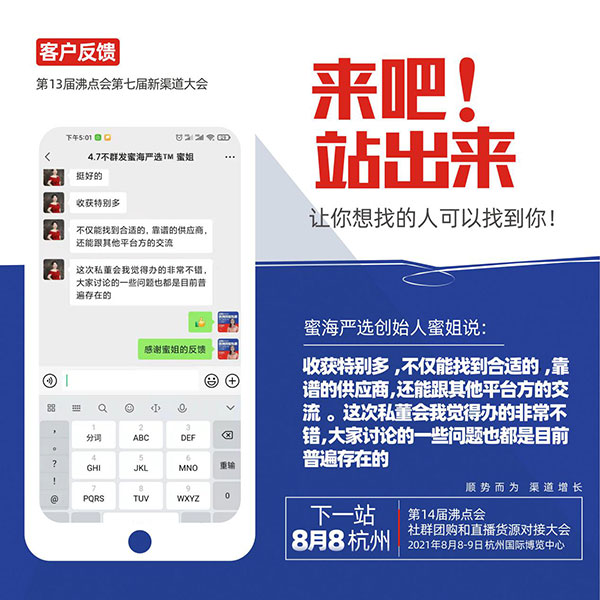 刚刚结束的第13届沸点会暨平台选品对接会,好评如潮,本次大会由沸点天下举办,吸引了来自全国的600多家供应链,和来自社群团购,社区团购,直播个人,直播机构,微信群,自媒体,平台等多个渠道的众多采购方前来找品合作,会后获得参会者一致好评,蜜海严选受邀参加活动。