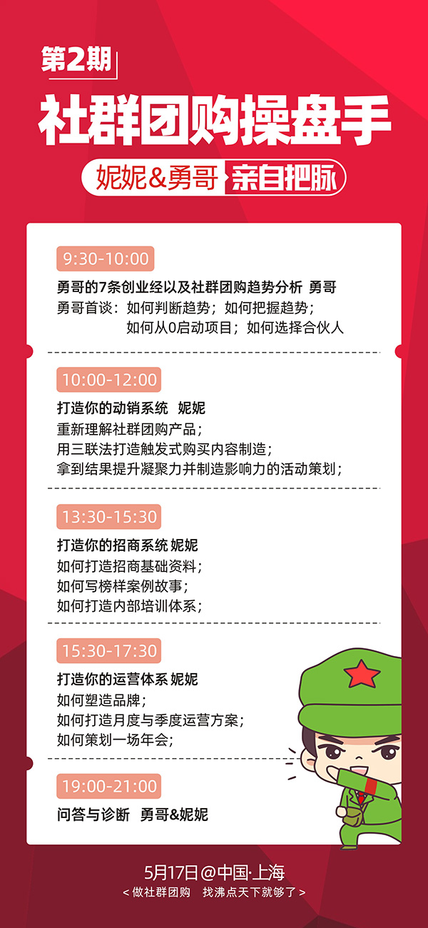 与此同时,5月17号还将举办第2期社群团购平台操盘手,与各位社群团购平台创始人一起洞察社群团购平台的底层逻辑,打通动销系统,招商系统和运营系统。是社群团购平台创始人的必修课。