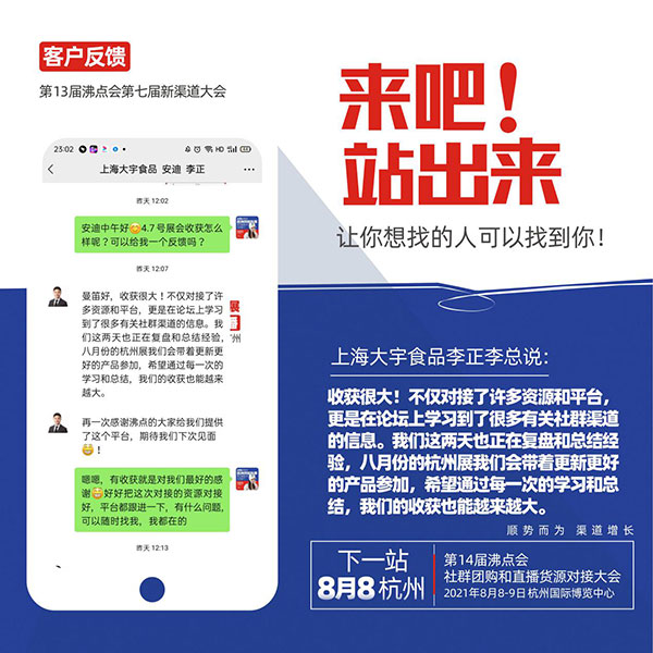 刚刚结束的第13届沸点会暨平台选品对接会,好评如潮,本次大会由沸点天下举办,由沸点天下举办,吸引了来自全国的600多家供应链,和来自社群团购,社区团购,直播个人,直播机构,微信群,自媒体,平台等多个渠道的众多采购方前来找品合作,会后获得参会者一致好评,上海大宇食品受邀参加活动。