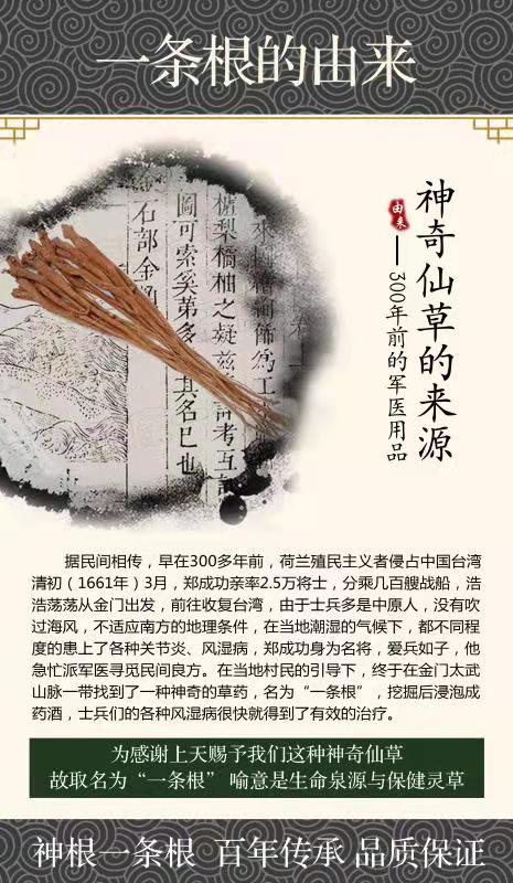 金牌一条根科技公司位于台湾屏东,由一群有着制造、研发酸痛贴布,30年经验的团队所创立的生医科技公司,专业研究开发草本萃取精油以温和不刺激,不伤皮肤效果加倍为诉求,制成酸痛贴,按摩霜,按摩油等系列产品。