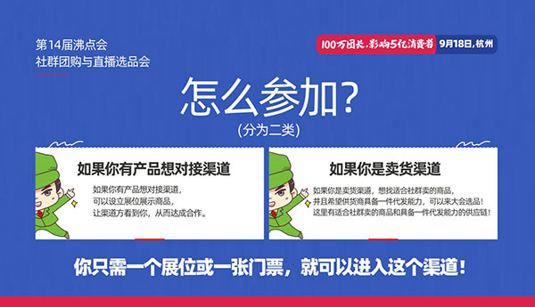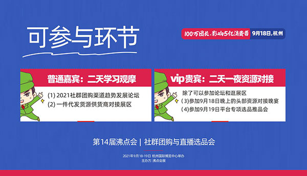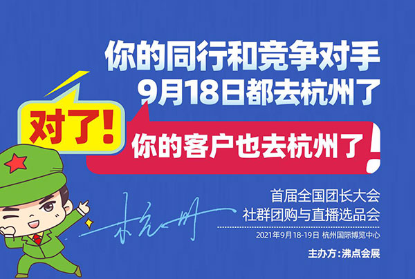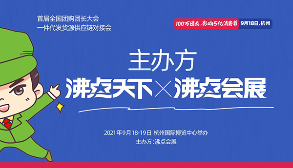 2021年9月18日,由沸点天下发起,沸点会展主办的第14届沸点会暨社群团购与直播选品会在杭州国际博览中心举办!同期举办首届全国团购团长大会一件代发货源供应链对接会。来自全国的社群团购平台、快团团、群接龙明星团长受邀参加!