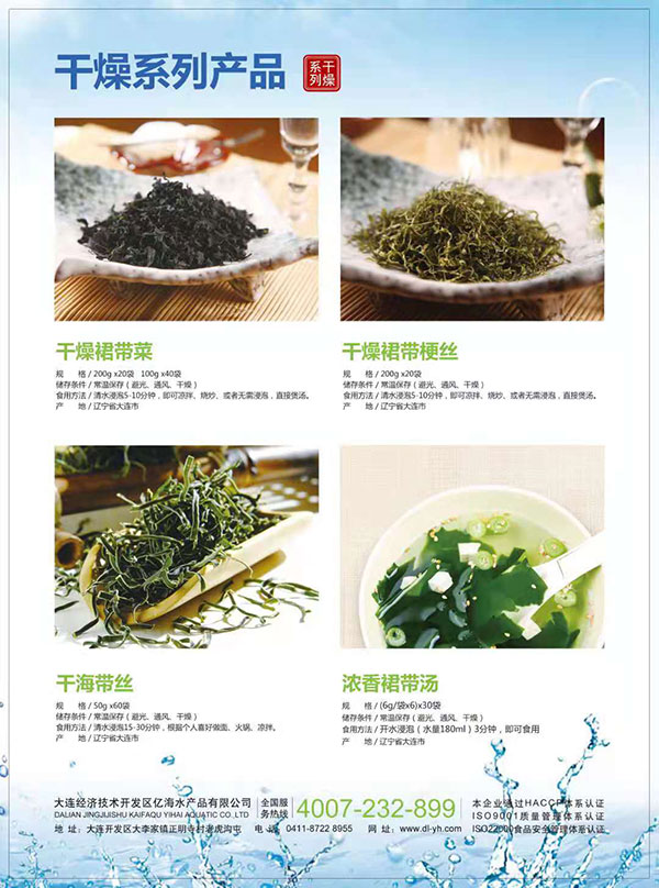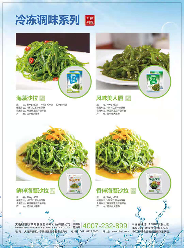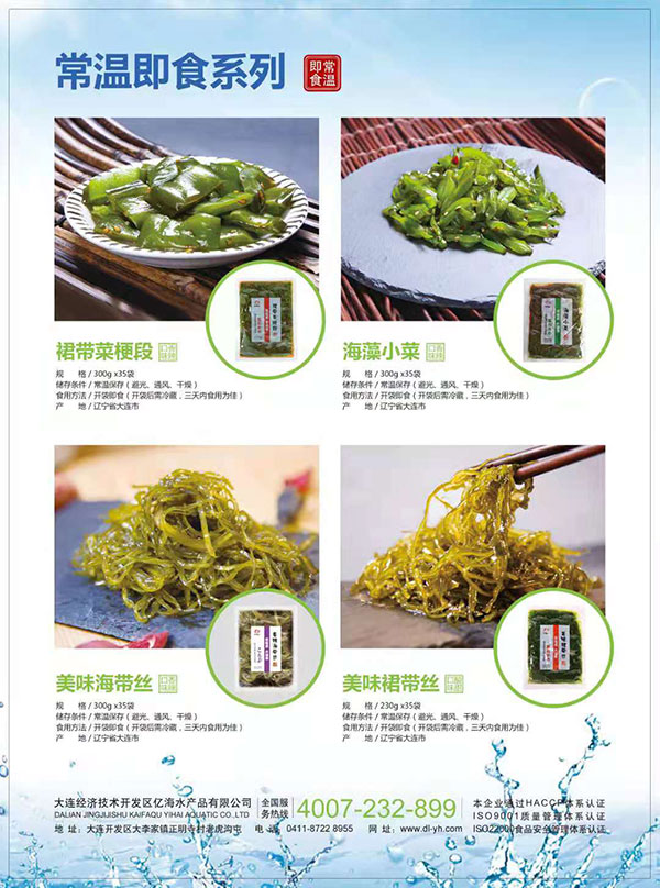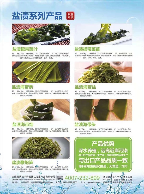 大连亿海水产品主要生产盐渍裙带菜、干燥裙带菜、贝类干制品、海参及各种藻类调味制品等。企业加工环节严格实行国际标准操作规范,目前公司已通过了HACCP、ISO9001和ISO22000等国际先进质量管理体系及卫生安全体系认证。产品除销往全国各地以外,还远销日本、韩国、澳大利亚、美国、香港、台湾等国家和地区。