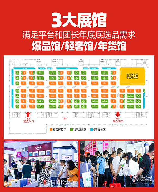 展位图解析:(一张图)3大展馆,满足平台和团长年底底选品需求。