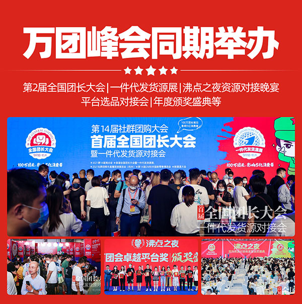 万团峰会同期举办第2届全国团长大会、一件代发货源展、沸点之夜资源对接晚宴、平台选品对接会、年度颁奖盛典等多项活动,丰富的内容安排让参与者看清行业趋势,学习实战经验,链接资源,达成合作实现销售增长。