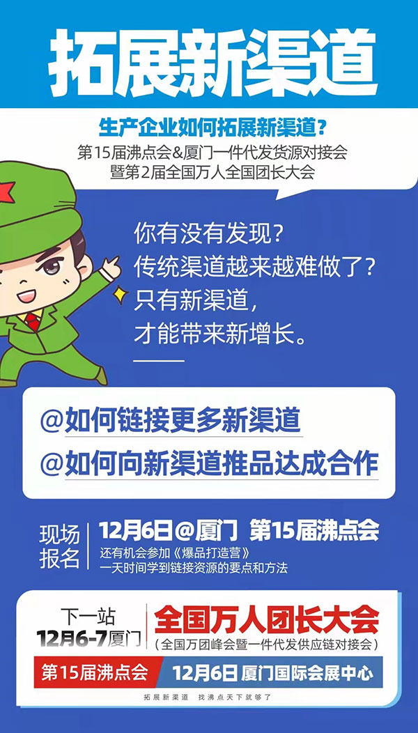 而现在报名第15届沸点会暨12月6号厦门第2届全国万人团长大会,还有机会参加【单品10万+爆品实战营】,学会方法再去沸点会上链接渠道,推品更高效,增长更给力。