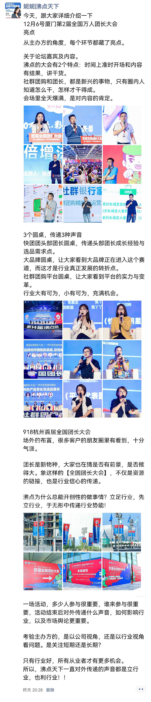 目前的内容,讲了一个沸点社群团购大会创办的历程故事,带大家回顾了14届社群团购大会的创办过程及亮点;接着讲了客户的反馈;昨天又带大家回顾了918杭州全国团长大会的幕后的故事;今天还会再继续…