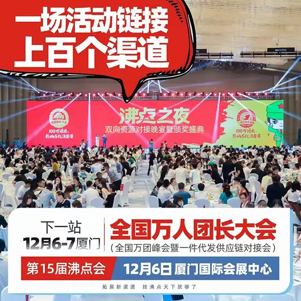 1.全国万人团长大会设置有4大链接环节,展会链接,晚宴链接,平台选品对接会链接,以及现场资源群链接,可以链接到数百个渠道方,获得更多上架合作的机会。