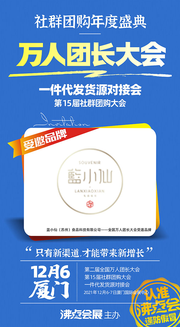 备受广大关注的厦门全国万人团长大会已定于2021年12月6-7日在厦门国际会展中心开幕!本届活动规模将达到万人,在招展开启后,已有数百家品牌和团队与沸点天下达成合作,参展厦门全国万人团长!近日,蓝小仙(苏州)食品科技有限公司强势参加此次活动!