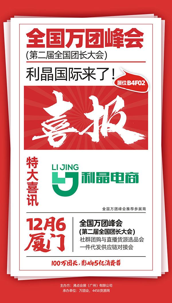 12月6号,厦门全国万人团长大会,规格高、规模大、资讯新、通路全,吸引了众多王牌企业参展。活动由沸点天下创办,由沸点会展主办,社群团购平台,各大工具平台头部团长聚集,是社群渠道的年度盛典。届时,母婴奶粉品牌经销商——广州利晶电子商务有限公司也将受邀参展。