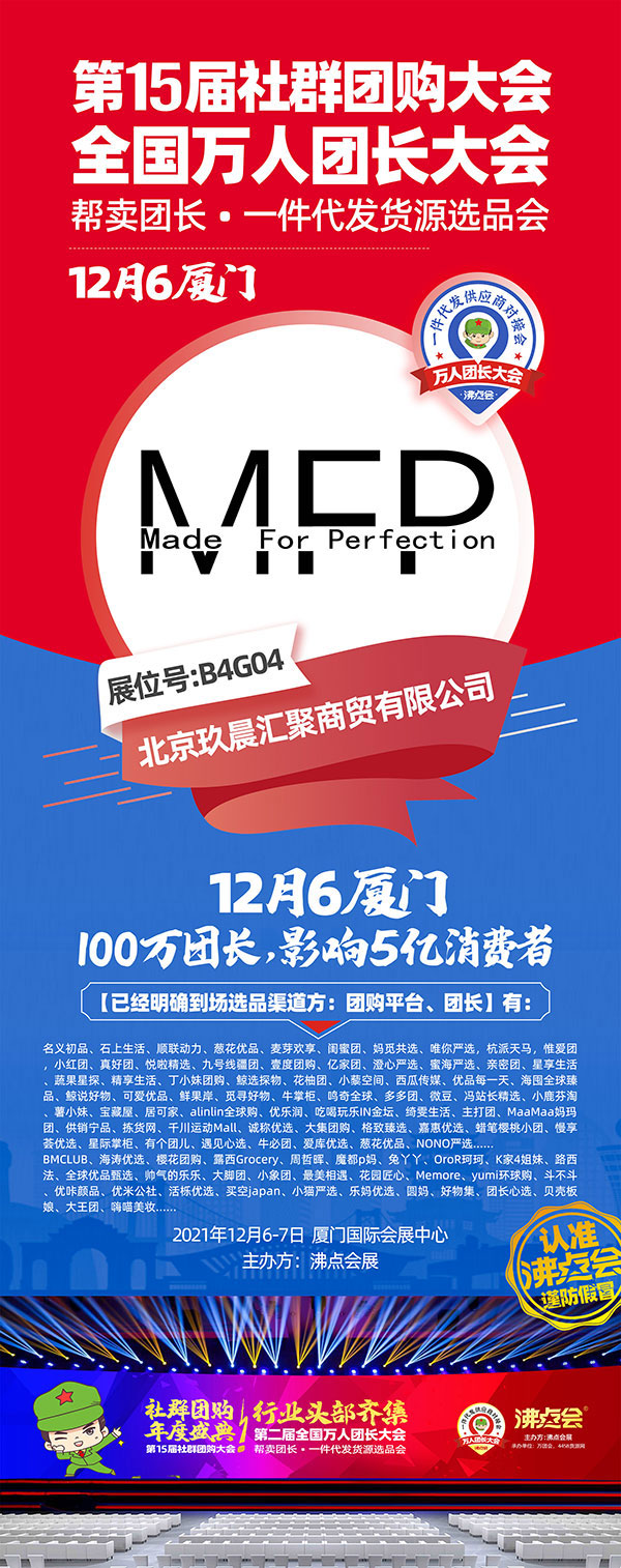 12月6号厦门第2届全国万人团长大会暨第15届社群团购大会,展位面积20000平,展商数量500+,新品爆品10000+,渠道方1000+,行业观众10000+,是社群渠道的年度盛典。如此盛典,北京玖晨汇聚商贸有限公司受邀参展厦门全国万人团长大会,届时欢迎您莅临B4G04展位参加!