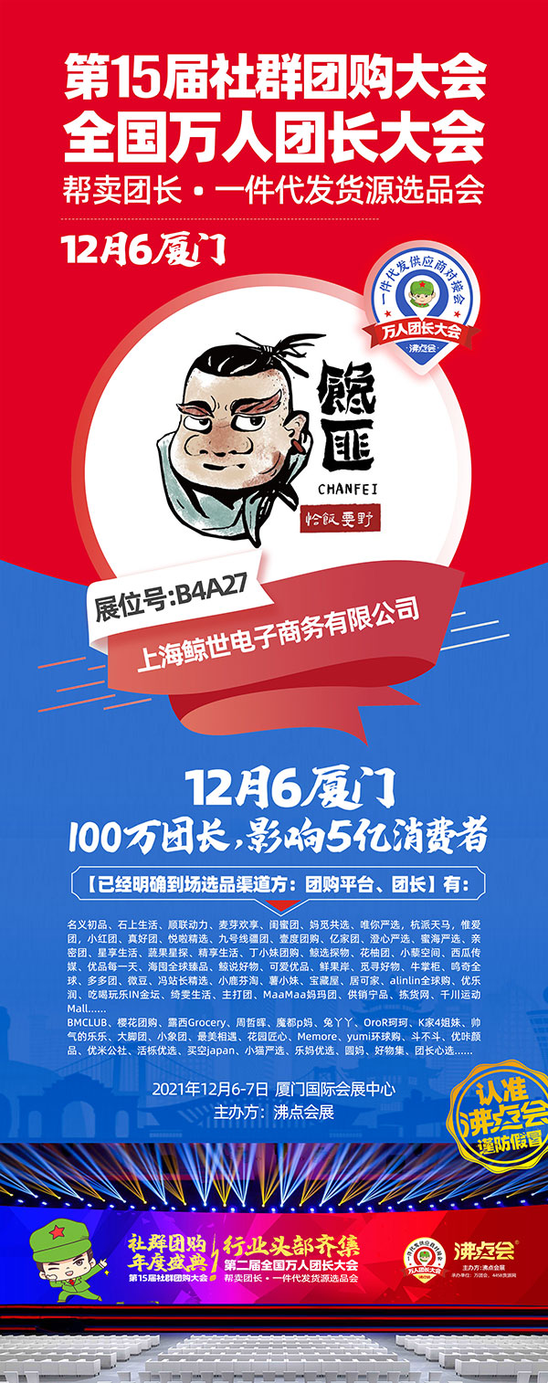 厦门全国万人团长大会定于12月6-7日在厦门举办,活动规模将达到万人,在招展开启后,已有数百家品牌和团队与沸点天下达成合作,参展厦门全国万人团长!届时,上海鲸世电子商务有限公司旗下中华特色即食小吃领导品牌——馋匪受邀参展厦门全国万人团长大会将受邀参展本次活动。