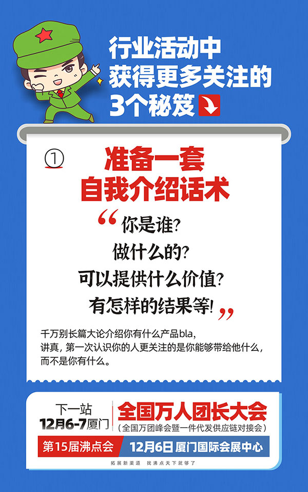 一定是把你的自我介绍准备好,你的产品哪里厉害,哪里销量好,有什么NB的地方等,先总结出来,现场直接抛出来,就会有很多人想要链接你。