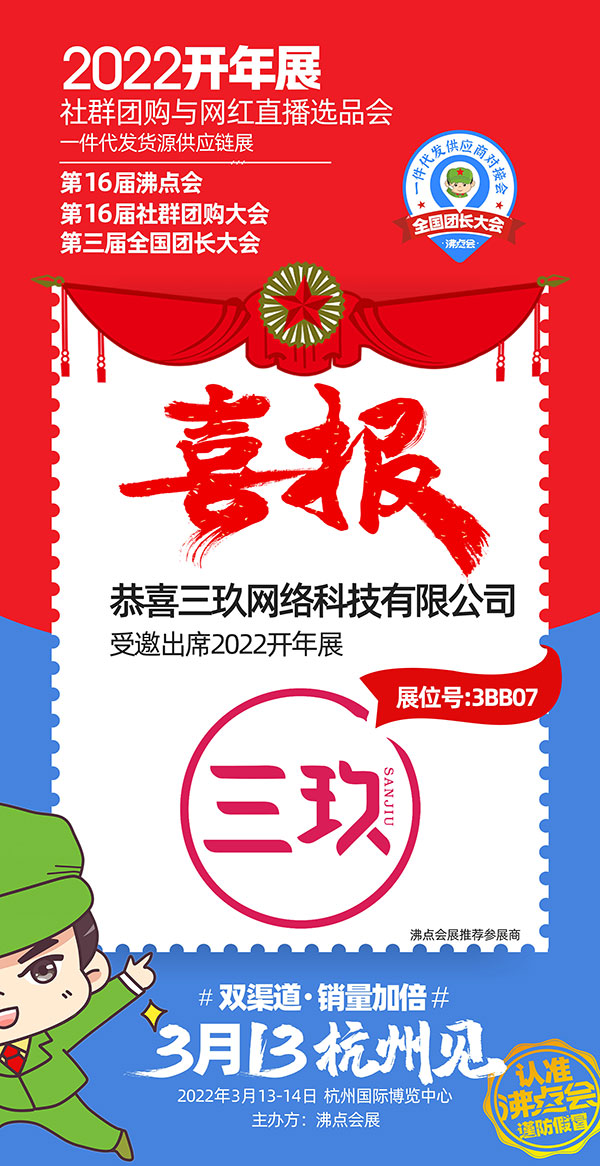 沸点会展主办的2022开年展暨第16届社群团购大会定于2022年3月13-14号在杭州国际博览中心举办,目前正在进行展位招募,参展商和平台方都在踊跃报名中,三玖网络科技有限公司受邀参展本次展会。