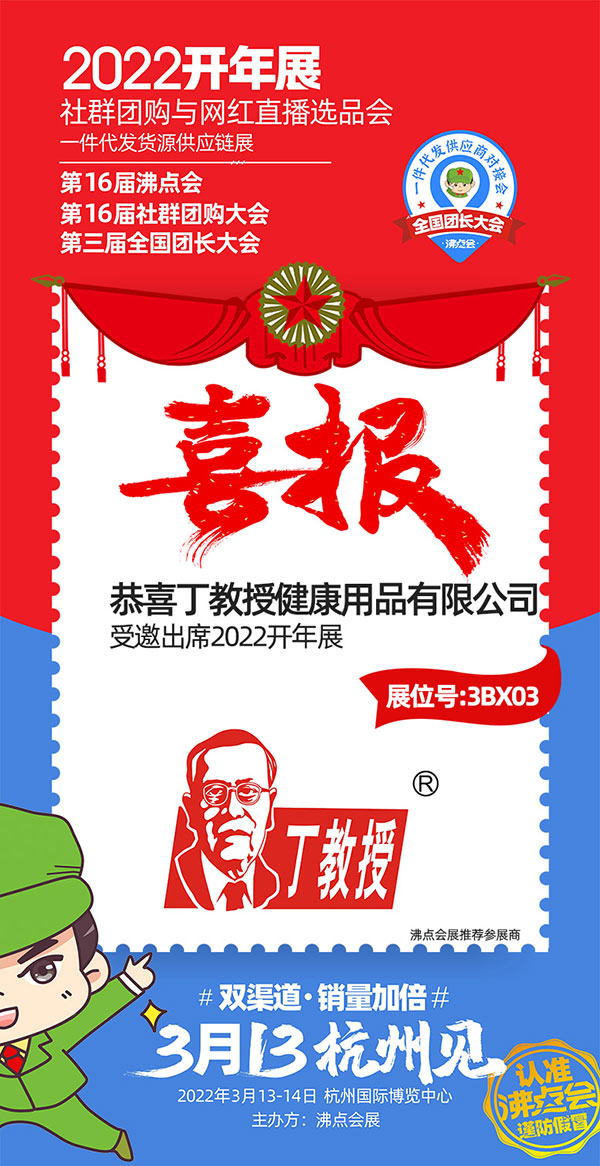 2022开年展暨第16届社群团购大会,吸引全国各个领域优秀的供应商资源,是一项以行业交流,促进品牌合作为目的的大型活动。3月13-14日,丁教授大健康产业集团与您相约杭州国际博览中心!锁定展位号:3BX03,期待你的到来!