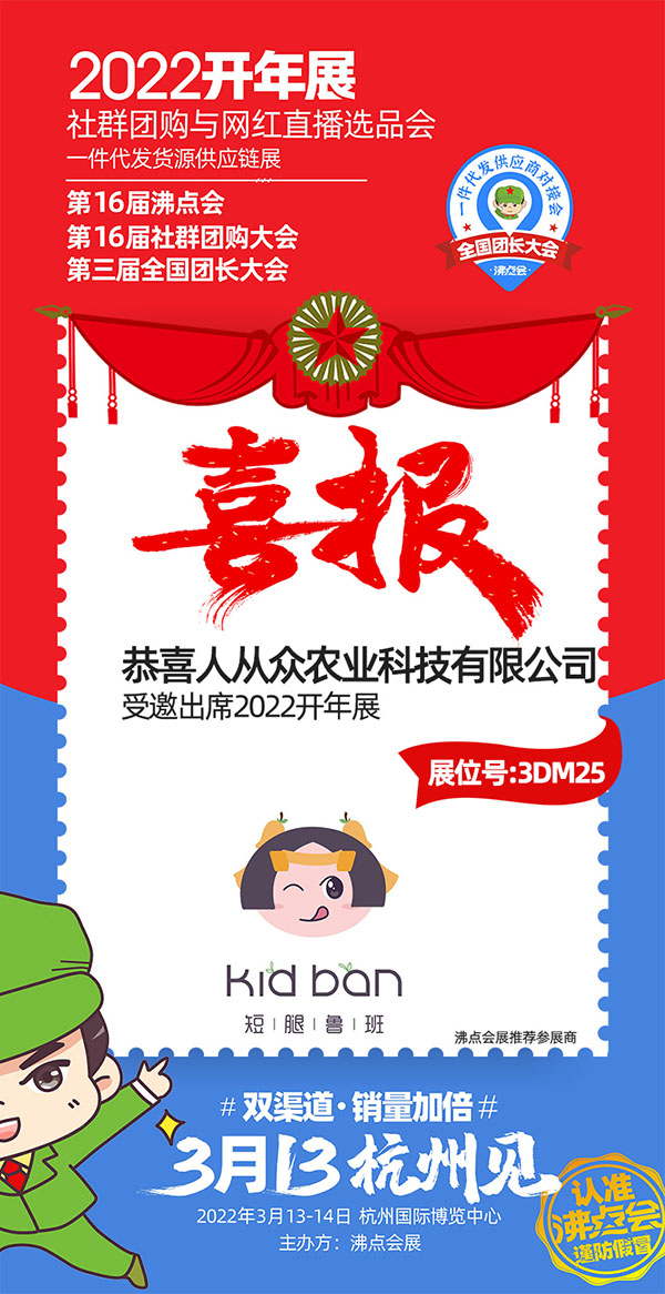 由沸点会展主办的2022开年展暨第16届沸点会(杭州)供应链展、社群团购与直播选品会、第三届全国团长大会&一件代发货源对接会系列活动将于3月13-14日在杭州国际博览中心隆重举办,将汇集全国优秀的具备一件代发货源的供应商集中展示,供各大平台和团长选品对接。届时,漳州市人从众农业科技有限公司旗下品牌“短腿鲁班”也将受邀参展。