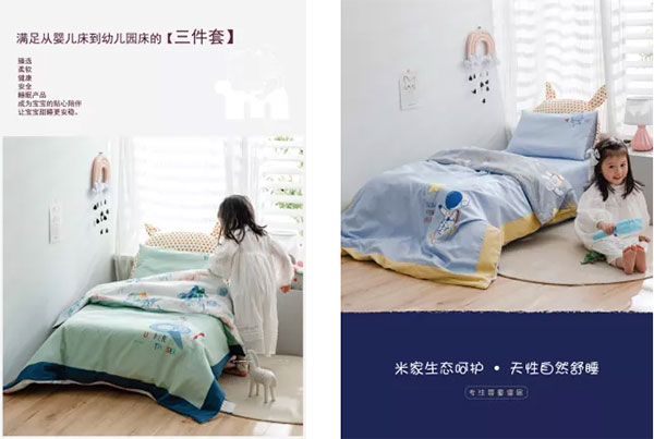 米家生态呵护,天性自然舒睡。南通米家纺织品有限公司专注婴幼儿童寝室家居用品,主要从事经营婴幼儿用品、幼儿园三件套、被类、毯类、睡袋类等系列床品的研发设计、生产、销售(支持一件代发)。