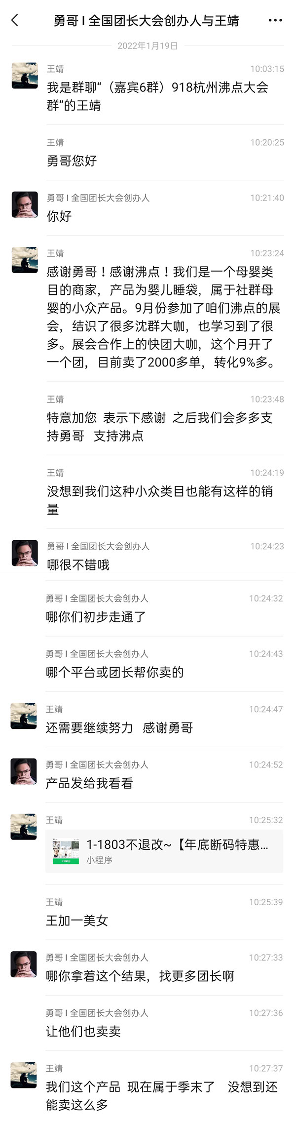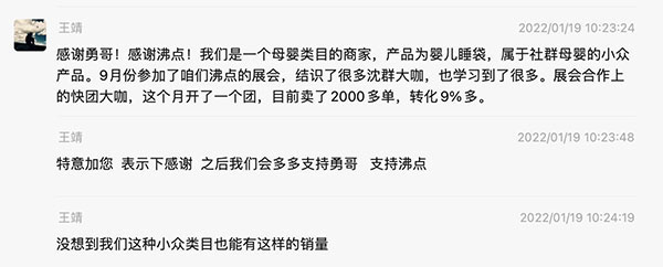一个做母婴小众产品的客户,在参加完9月份,沸点在杭州举办的第2届全国团长大会,跟勇哥反馈:感谢勇哥!感谢沸点!我们是一个母婴类目的商家,产品为婴儿睡袋,属于社群母婴的小众产品。9月份参加了咱们沸点的展会,结识了很多沈群大咖,也学习到了很多。展会合作上的快团大咖,这个月开了一个团,目前卖了2000多单,转化9%多。没想到我们这种小众类目也能有这样的销量。