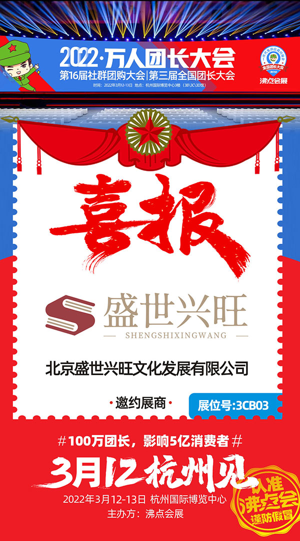 这是盛世兴旺图书供应链首次参加沸点全国团长大会,旨在认识更多的团长和供应链,增加资源。3月12—13日,盛世兴旺图书供应链与您相约杭州国际博览中心3CB03展位,期待和大家一起变得更好!