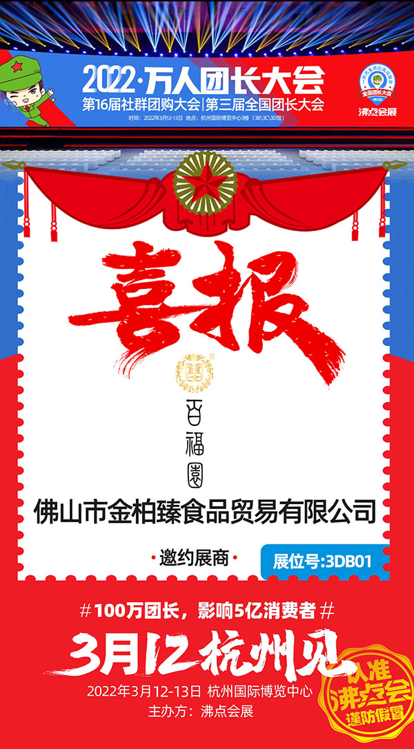 2022杭州全国团长大会,一件代发货源对接会定于2022年3月12-13号在杭州国际博览中心举办,目前正在进行展位招募,参展商和平台方都在踊跃报名中,金柏臻食品贸易有限公司受邀参展本次展会。