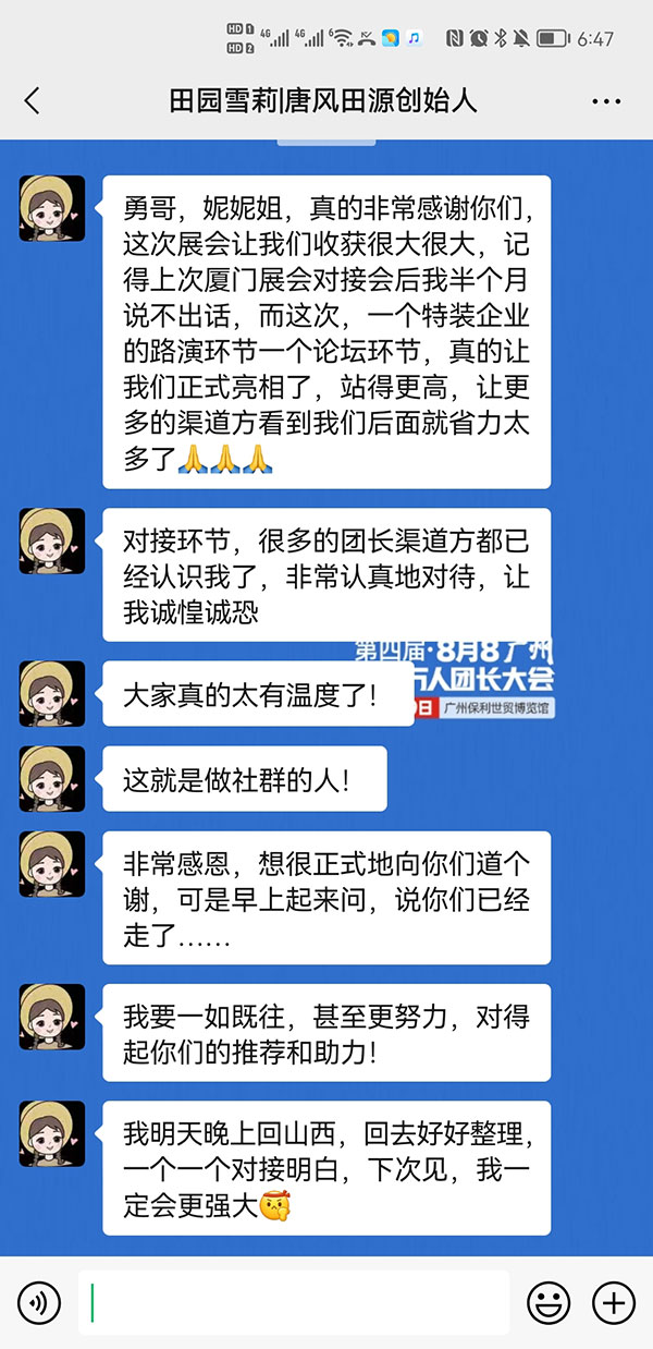 展会过后,雪莉反馈:真的非常感谢你们,这次展会让我们收获很大很大,这次一个特装企业路演环节一个论坛环节,真的让我们正式亮相了,站得更高,让更多的渠道方看到我们。后面省力太我太多了。对接环节,很多的团长渠道方已经认识我了,非常认真地对待。