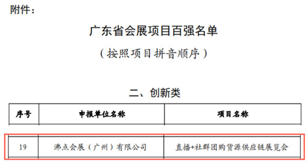 广东省商务厅经完成项目申报、初步评审、专家评审、主管部门核查、公示等程序,最终确定的广东省会展项目百强名单予以公布。沸点会展主办的直播+社群团购货源供应链展览会入榜在百强名单内,位列于创新类,意味着沸点会展此项目今后在会展宣传推介、 政策扶持等工作中,可按规定获得优先支持 。