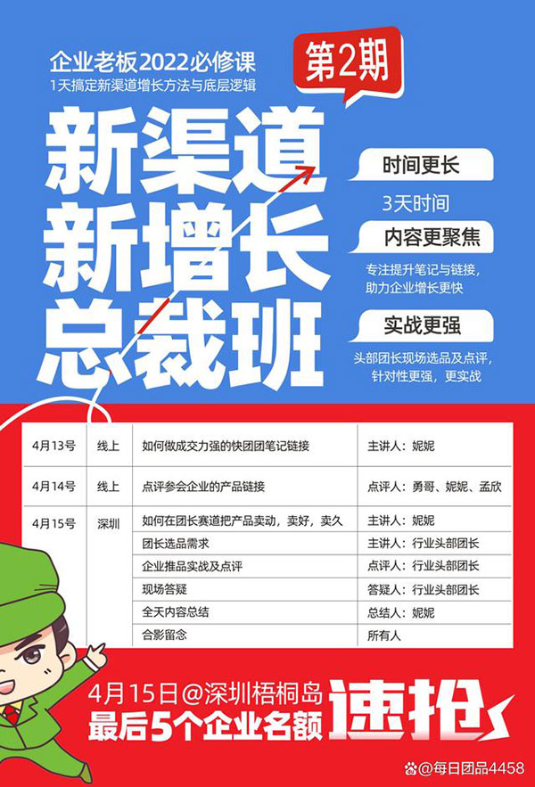 新渠道新增长总裁班是由沸点天下主办的,助力企业针对团长这个赛道,梳理素材内容,学会链接推品方法,实现销售增长的一个课程。