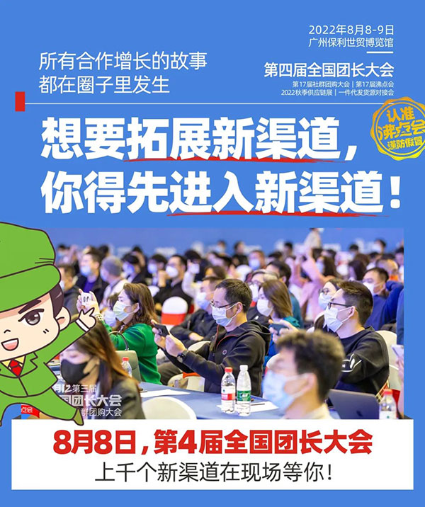 2022年8月8号,第4届全国团长大会暨第17届社群团购大会将在广州保利世贸展览馆举办,上千个新兴渠道方会来现场选品,想要拓展新兴渠道的企业一定要来。