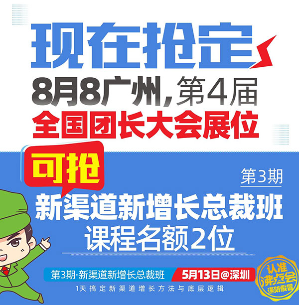 8月8广州团长大会展位正在抢定中,现在预定8月8号展位还有机会获得5月13号第3期新渠道新增长总裁班名额1个,赶紧抢定吧。