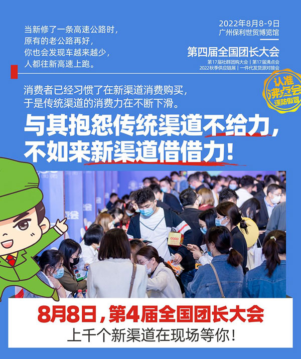 8月8,第4届全国团长大会暨第17届社群团购展将在广州保利世贸展览馆举办,想要拓展新渠道的你,一定要来。