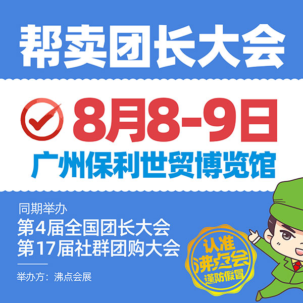 2022年8月8号,全国帮卖团长大会将在广州保利世贸展览馆举行,同期还将举办第4届全国团长大会和第17届社群团购大会,举办方是沸点会展。