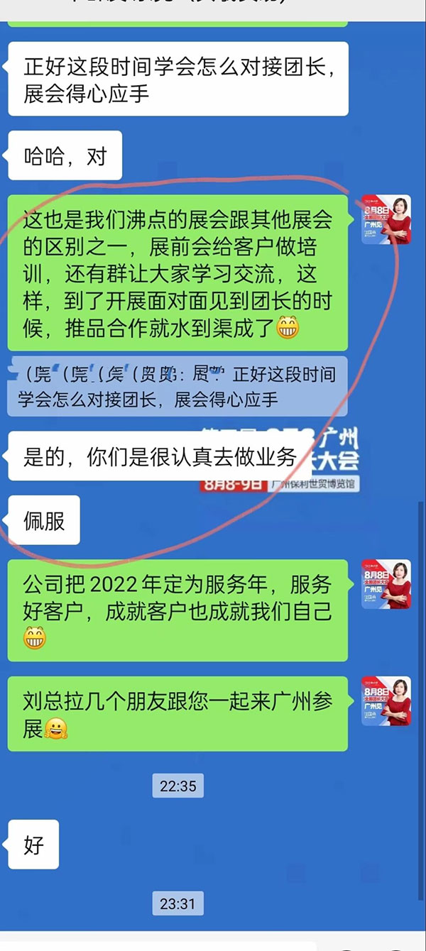 这张图,是客户发给我司沸点会展销售总监江国燕的,江国燕回忆说:刘总找我定展位的时候,当时他是犹豫的,进来了过后,参加了我们的新渠道新增长总裁班的培训,也在我们的锦鲤群里学习了不少知识,推品得心应手,展会还没开始就已经跟团长合作上了。