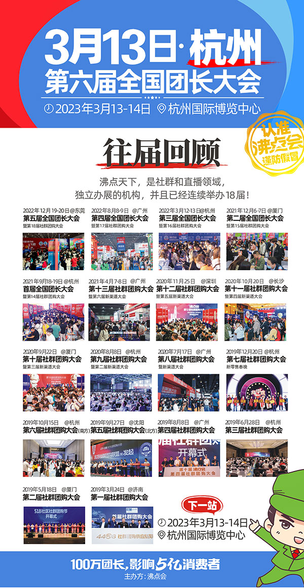 由沸点会展举办的杭州全国团长大会,3月13-14日在杭州国际博览中心举办,超4万平的展览面积,上万款货源,超多服装类新品爆品,等你来选。