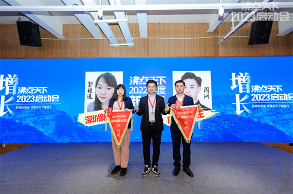 沸点天下董事长勇哥为2022年度广州团队销售冠军郭浩,2022年度深圳团队销售冠军陈海燕(陈利兰代)颁奖;