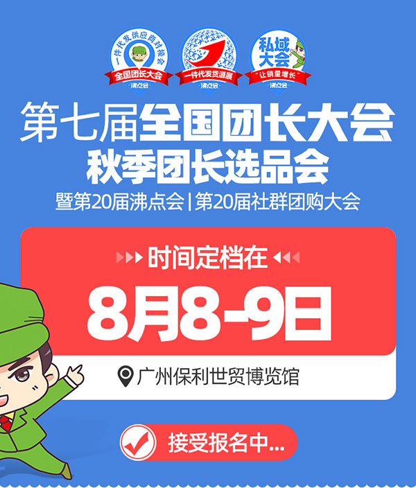 名称:第七届全国团长大会、第20届沸点会暨第20届社群团购大会、(广州)直播带货+社群团购货源展览会