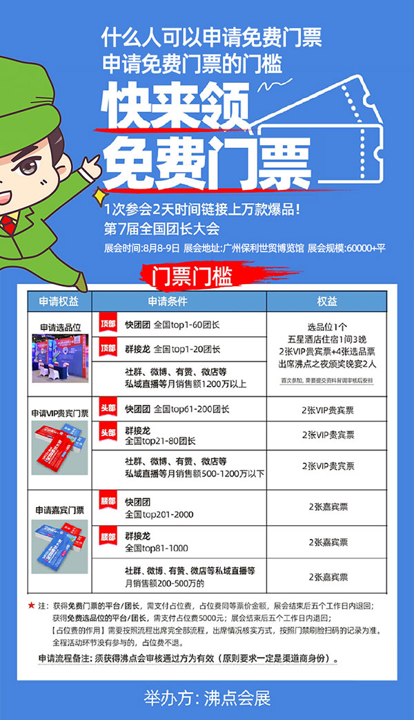 2023年沸点会排期:全国团长大会(第六届)3月13-14日在杭州国际博览中心,全国团长大会(第七届)8月8-9日在广州保利世贸博览馆举办,敬请关注。